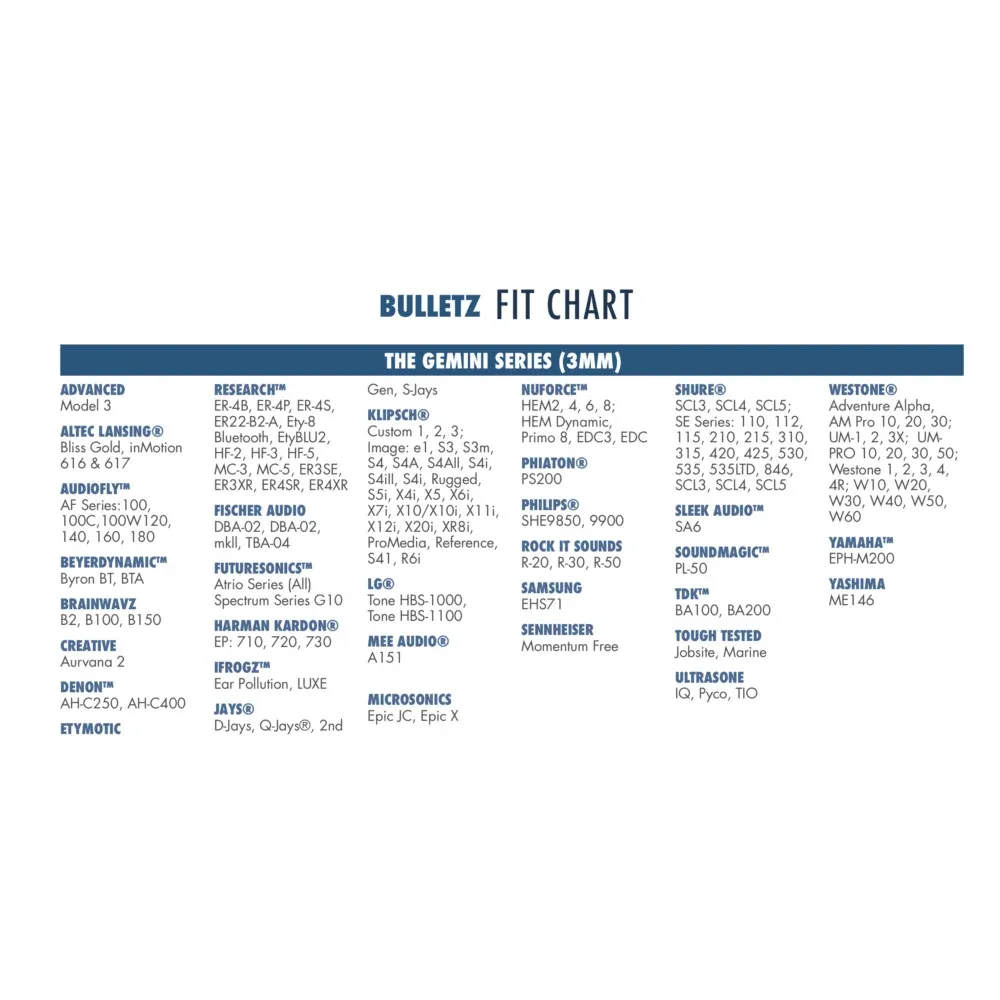 Creative Aurvana In-Ear 2, Klipsch Image S4i, Klipsch S3M, Klipsch Image S4A II, Klipsch R6, Klipsch Image X7i, Klipsch R6i, Klipsch X4i, Klipsch R6 BLUETOOTH IN-EAR, Klipsch X6i REFERENCE IN-EAR, Klipsch X12 Neckband BT, Klipsch X11i, Klipsch X12i REFERENCE IN-EAR, Klipsch X20i REFERENCE IN-EAR, Sennheiser Momentum Free (M2 IEBT SW), Shure AONIC SE215, Shure Aonic 215, Shure Aonic 215 Gen 2, Shure AONIC 5, Shure AONIC 4, Shure AONIC 3, Shure SE115 M+, Shure SE535, Shure SE310, Shure SE210, Shure SE215, Shure SE425V, Shure SE315, Shure SE425, Shure SE846, Shure SE112, Beyerdynamic Byron BT, creative AURVANA IN-EAR2 PLUS, Denon AH-C250, Etymotic Research ER3XR, Etymotic Research EVO, Etymotic Research ER3SE, Etymotic Research ER4XR, Etymotic Research ER2XR, Etymotic Research ER3SE-LE, Etymotic Research ER3XR-LE, Klipsch S4 II, Klipsch S3, Ultrasone IQ PRO, Ultrasone Pyco Black, Ultrasone Tio, Ultrasone IQ, Westone Pro X20, Westone Pro X50, Westone Pro X30, Westone W80 v3, Westone UM PRO30, Westone B50, Westone |