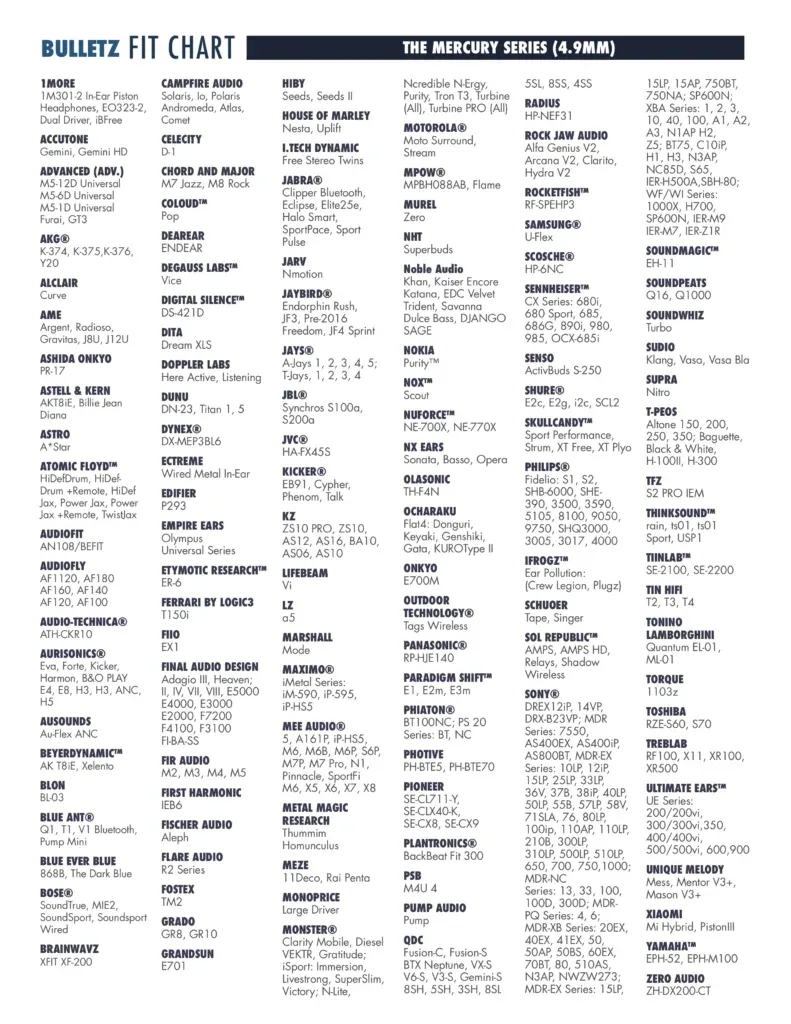 Beyerdynamic XELENTO, Shure SCL2, Meze RAI Penta, Astell & Kern Diana, 1More True Wireless, Audiofly AF120, Audiofly AF140, Audiofly AF160, Audiofly AF180, MAXIMO iMetal Series, Audiofly AF100, Campfire Audio Solaris, Campfire Audio lo, Campfire Audio Polaris, Campfire Audio Andromeda, Campfire Audio Atlas, Campfire Audio Comet, Celecity D-1, Accutone Gemini, Accutone Gemini HD, Advanced M5-12D Universal, Advanced M5-6D Universal, Advanced M5-1D Universal, Advanced Furai, Advanced GT3, AKG K374, AKG K375, AKG K376, AKG Y20, Alclair Curve, AME Argent, AME Radioso, AME Gravitas, AME JBU, AME J12U, ONKYO PR-17, Astell & Kern AKT8iE, Astell & Kern Billie Jean, Astro A*Star, Atomic Floyd's HiDefDrum, Atomic Floyd's HiDef Drum +Remote, Atomic Floyd's HiDef Jax, Atomic Floyd's Power Jax, Atomic Floyd's Power Jax +Remote, Atomic Floyd's Twist Jax, Audiofit AN108, Audiofit BEFIT, Audiofly AF1120, Audio-Technica ATH-CKR10, AURISONICS Eva, AURISONICS Forte, AURISONICS Kicker, AURISONICS Harmon, AUSOUNDS Au-Flex ANC, Bey |
