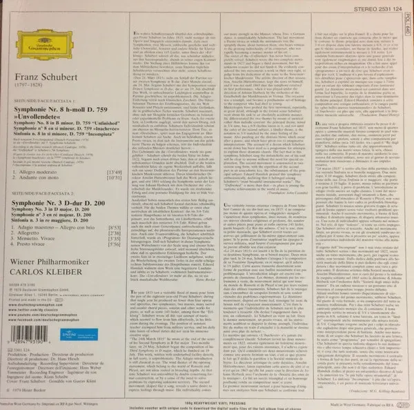 Franz Schubert, Wiener Philharmoniker, Carlos Kleiber – Symphonien No.8 - Unvollendete - No.3 - LP